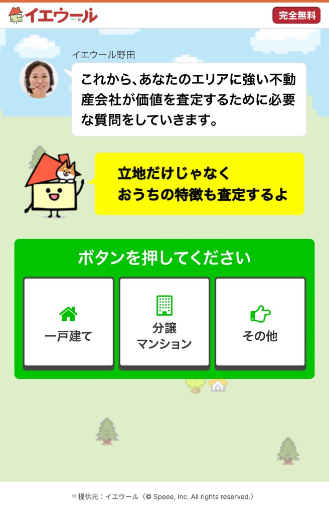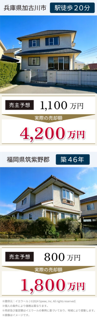 安値で売って後悔しないために!プロがあなたの物件価値を瞬時に評価する神ツールがスゴい 2024.08.192024.12.24 「想定より高く売れた」との声も!プロがあなたの物件価値を評価する神ツールがスゴイ!(売却事例も絶賛公開中♪) 不動産の売却ってわからないことだらけで不安ですよね。。。そもそも何から始めれば良いのかわからない。。。▼こんな悩みありませんか?・安値で売ってしまわないか心配・売却価格が適正かどうかわからない・手続きに手間がかかりそうこんな悩みとは今日でおさらば!この記事を最後まで読めば、不動産売却に関する不安を一瞬で解決してくれる方法がわかります! 親から不動産を相続したけれど… 親が長年住んでいた実家の一戸建てを相続したものの、将来の価値がどう変わるのか予測できなくて、売却するべきか、それとも保有しておくべきか本当に悩んでいました。実家は田舎にあり、僕は首都圏に住んでいるので管理も大変だし、どうしたらいいのか…。 そこで、・地元の不動産会社に相談してみたり(思ったより低い評価でがっかり…)・周辺の売却事例を調べたり(築年数などによってバラバラ…)いろいろ試してみたのですが、結局悩みは解決できず…orz 「住まないのに維持費だけを払い続けながら、このままずっと放置し続けるのか…」と、お手上げ状態でした。 そんな時、たまたまインスタを見ていたら・・・ こんな投稿を発見しました。気になってネットで色々調べてみると「不動産査定額は不動産会社によって差がある」とのこと・・・。「査定額に差がある?そんな話があるわけない」と思ってさらに調べてみると… 複数の不動産会社に査定を依頼した人のうち、金額に100万円以上の差があった人が6割以上いることがわかりました! そんなに違うなら!ということで僕の物件を何社かに査定依頼してみた結果・・・・・・なんと400万円も差があることがわかりました! 私が使った神サービスはコレ↓ 不動産の売却で悩んでいるあなたに、最適な査定価格を教えてくれる神サービス・・・それは・・・・・・ イエウールの不動産一括査定サービスです!イエウールなら、スマホからカンタンに査定依頼でき、あなたの不動産の本当の価値を教えてくれます。 まずかんたんな質問に答えたあと、売りたい家の建物面積を入力します。 その後、名前や年齢などを入力します。 コレで査定依頼ができちゃう便利なサービスなんです!あなたと同じように不動産売却について悩みを持つ方がたくさん利用しているんだそうです! イエウールの不動産査定がスゴイ理由が合理的! イエウールは提携不動産会社数が2,500社超で国内No.1!幅広いネットワークからあなたの不動産に合う不動産会社をピックアップできます!他の査定サービスで出会えない不動産会社に出会えるかも♪ 他社では、査定できる会社の数が2~3社に限られていることがあり、選択肢が狭まってしまうことがあります。 AIによる即時査定を提供しているところもありますが、精度が低く査定額の信頼性に不安があることも。 さらに、他の査定サービスは地域特化型が多い中、イエウールはエリアカバー率が国内No.1で、全国47都道府県すべての不動産査定依頼に対応! 他社では査定できなかったエリアの物件でも、イエウールなら対応してくれる可能性が高いのです。 上場企業だから安心! あなたの不動産の適正な価値がわかるイエウールは東証スタンダード市場の上場企業、株式会社Speeeが運営しています! よく「ちゃんと対応してくれればそれでいい」という人がいますが、不動産査定は信頼できるサービスを選ぶべきですよね♪ 査定依頼者数が国内No.1! さらに、イエウールは月間の査定依頼者数が30,000件を超え国内No.1!たくさんの方に選ばれており、安心してご利用いただけます。 「想定より高値で売れた」との声も! イエウールで実際に査定依頼した方の事例がこちら♪ 地方の築年数が古い物件や駅から少し遠い物件でも、こんなに高額で売却した実績があるんです!! 不動産価格が上昇傾向の今こそチャンス! 国土交通省の調査によると、2016年から日本の不動産市場価格は全国的に上昇傾向にあります。だからこそ適正価格を知るために査定サービスを利用するのが賢い選択♪知人にこっそりイエウールを勧めたら…「イエウール知ってるよ!てか俺も使ってるよ。まだ使ってなかったの?笑」と言われました。。。この機会にあなたも試してみませんか? 無料査定できる ※各種情報に基づいたフィクションであり数ある見解のうちの一見解です